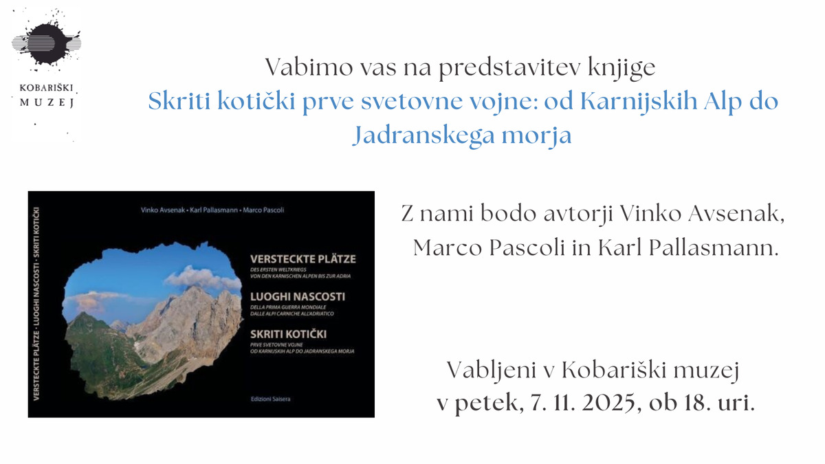 V petek, 7. novembra 2025, ob 18. uri, vas vabimo v Kobariški muzej na predstavitev knjige Skriti kotički prve svetovne vojne: od Karnijskih Alp do Jadranskega morja. Z nami bodo avtorji Vinko Avsenak, Marco Pascoli in Karl Pallasmann.