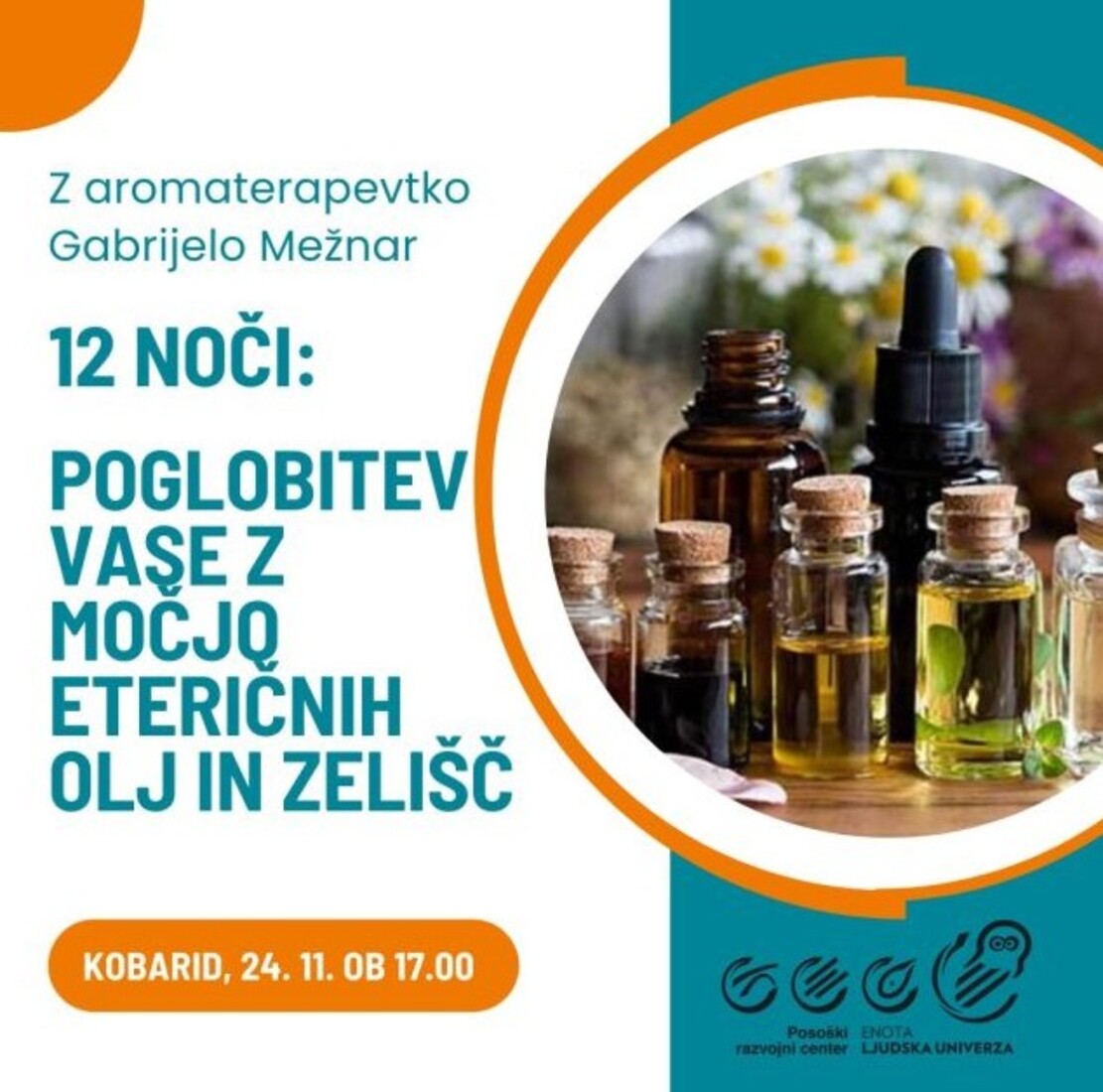 Čas med 25. decembrom in 6. januarjem je idealen za umiritev, refleksijo in povezovanje s samim seboj. Namesto hitenja in stresa si privoščite trenutke tišine in notranjega miru. Z eteričnimi olji in zelišči boste ustvarili svoj osebni ritual, ki vas bo vodil skozi 12 dni introspektive. Vzeli si boste čas zase, se naučili izbranih tehnik aromaterapije in s seboj odnesli znanje, ki vam bo služilo tudi po praznikih.