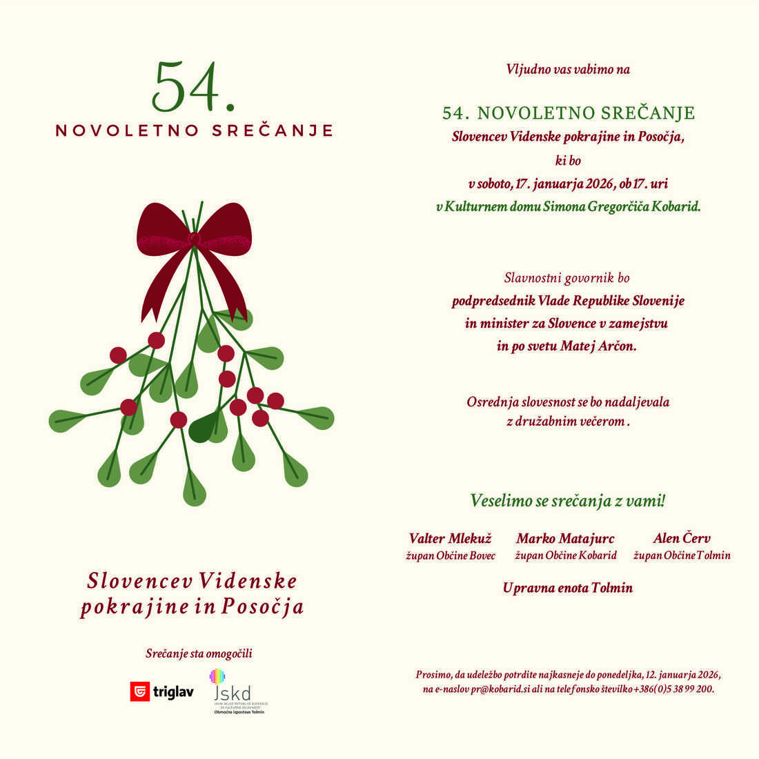 Kobarid bo v soboto, 17. januarja, popoldne gostil tradicionalno, že 54. Novoletno srečanje Slovencev Videnske pokrajine in Posočja, ki ga vsako tretjo soboto v januarju pripravljajo tri posoške občine, Upravna enota Tolmin in Posoški razvojni center. Osrednja slovesnost bo ob 17. uri v Kulturnem domu Simona Gregorčiča Kobarid, kjer bo tokratni slavnostni govornik podpredsednik Vlade Republike Slovenije in minister za Slovence v zamejstvu in po svetu Matej Arčon, zaslužnim pa bodo podeljena Gujonova priznanja. Pozdrav iz Benečije bo prinesla priznana kulturna delavka in pesnica Margherita Trusgnach, kulturni program pa bodo oblikovali Ljoba Jenče in Oktet Simona Gregorčiča Kobarid.