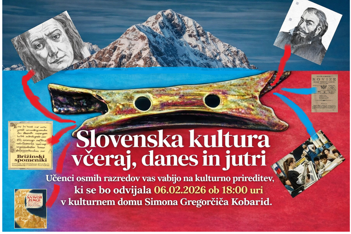 Učenci osmih razredov Osnovne šole Kobarid vas vabijo na KULTURNO PRIREDITEV, ki se bo odvijala 6. 2. 2026 ob 18. uri v Kulturnem domu Simona Gregorčiča Kobarid.